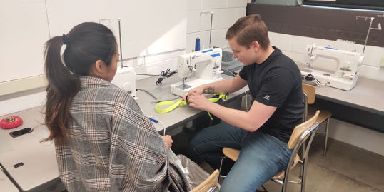 To manufacture the prototype, we used nylon webbing, ripstop waterproof fabric, dense upholstery foam, plastic buckles, metal D-rings, and metal lobster clasps, all held together with a combination of black and white sewing thread. The product is mainly mannufactured by using sewing machines.